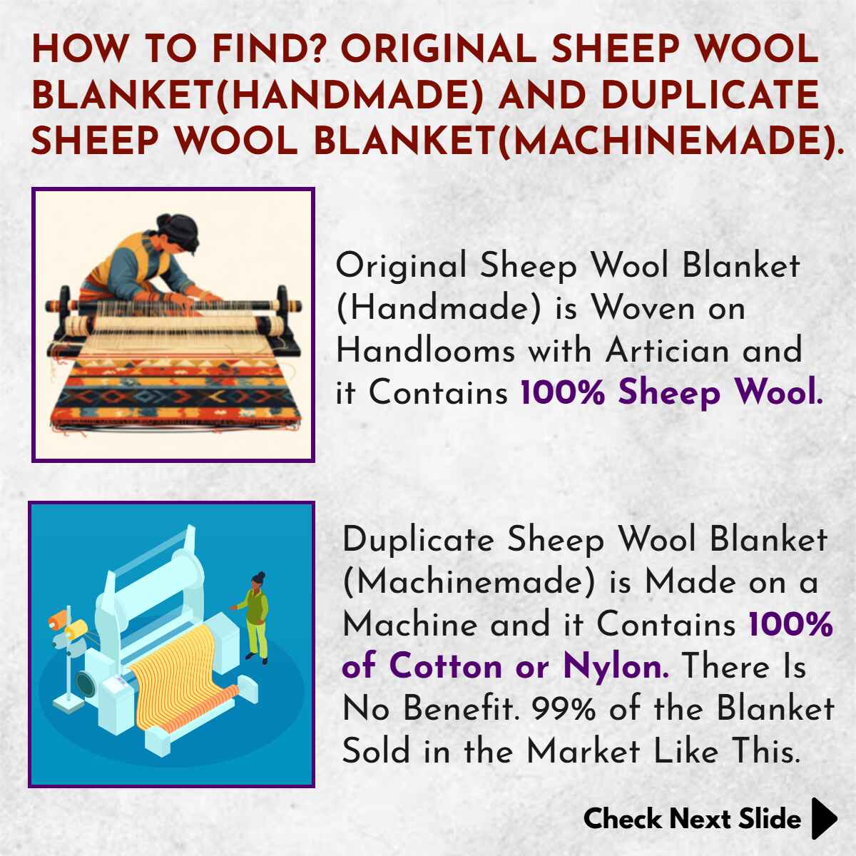 हातमागावरील घोंगडी मशीनमेड घोंगडीच्या प्रमाणात दिसायला जरी आकर्षक नसेल पण आरोग्यविषयक, धार्मिक व अन्य फायदे हे फक्त हातमागावरील घोंगडीमुळेच मिळतात. तर कधी हि, कुठून हि घोंगडी खरेदी कराल तर घोंगडी हातमागावरील आहे का? मशीनमेड? असा प्रश्न करायला विसरू नका. जे प्रामाणिक आहेत ते खरं सांगतील व काही जण लबाडी करतील. AhilyaStore येथे सर्व हातमागावरील घोंगडी उपलब्ध आहेत.